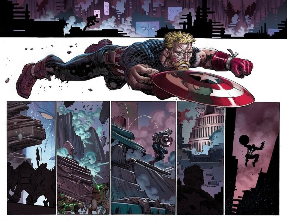 Y si lo es, en primer y último término, es debido al impresionante despliegue que llevan a cabo John Romita Jr. y sus tres compañeros entintadores: con Scott Hanna, Klaus Janson y Tom Palmer embelleciendo sobremanera sus lápices —de ellos me quedo, siempre lo he hecho, con la magnífica forma en la que trata el último las planchas de Romita—, el tono épico que el veterano artista marvelita confiere a las aventuras del Capi en la dimensión regentada por Arnim Zola es de lo mejor que hemos visto en las páginas del soldado convertido a superhéroe. Alternadas con momentos íntimos, esos que Remender dedica a explorar la relación paterno-filial que es motor fundamental de este primer arco argumental de la cabecera, pasear la mirada por este volumen es darse de bruces con un ejemplo sumo de lo que debe ser un buen cómic de tipos enfundados en mallas.