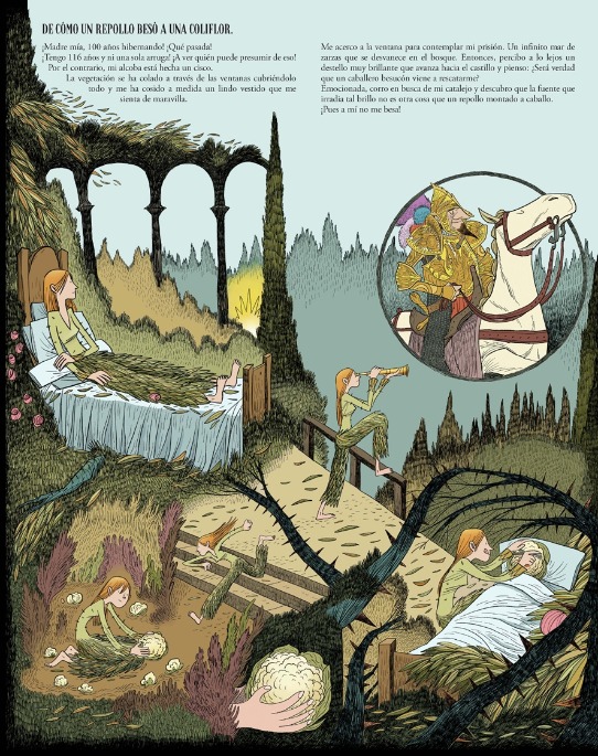 Tan feminista discurso, muy acorde con estos tiempos, queda engalanado, como ya pasara con Caperucita, con unas ilustraciones ante las caer rendido: mi primera recomendación, antes de intentar acometer la lectura, es que toméis la concertina en vuestras manos, os vayáis a la mesa del comedor, la despejéis de todo ornamento y despleguéis en toda su gloria el metro y noventa y cuatro centímetros que alcanzan, sumados, los ocho cuerpos de ‘La bella durmiente’. ¡Ah, casi se me olvida!. Hacedlo sentados, no os vaya a dar un vahído ante la belleza plástica que tendréis ante vuestros ojos. Toda vez hayáis repetido el proceso por la otra cara —de nuevo, sentados— será el momento de replegar las páginas y dejarse entretener por las líneas de un cuento que, insisto, nunca ha estado tan condenadamente bien dibujado. Y eso que, entre las incontables versiones que de él se han hecho, se cuenta la de mi adorado Stephen Cartwright. ¿Cómo? ¿Que quién es Stephen Cartwright? No es este el momento de responder a esa pregunta, pero espero poder hacerlo en breve con un pequeño artículo dedicado a tan ilustre británico.