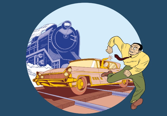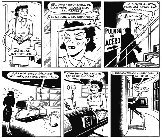 Hoy, sin embargo, nos vamos a centrar en un ejemplo más concreto a través del tomo ‘Atajos’ que ha publicado La Cúpula. Su autor, Martí Riera, comenzó a publicar a finales de los 70 en la revista ‘El Víbora’, de donde se extraen muchas (o todas, lo cierto es que no se especifica) las historias cortas que componen este volumen. Su estilo bebe principalmente de dos influencias muy determinadas. Por un lado, la más evidente a nivel estético es la del historietista Charles Burns, por su uso del blanco y negro, y por la expresividad, algo grotesca en ocasiones, de sus personajes. También coincide con él en ese cierto halo de surrealismo que planea sobre sus cómics. Este surrealismo nos conecta con la segunda referencia en su obra, esta vez cinematográfica: la de los filmes de David Lynch. Especialmente la de la película ‘Cabeza borradora’ (1977), tal y como podemos ver en la historia que abre este tomo: «El mundo de Óscar».