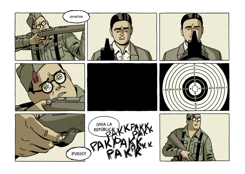 Si bien es esta una obra que Roca firma junto al periodista Rodrigo Terrassa, espero que éste último no se ofenda si por un casual llega a leer estas líneas al encontrarse la afirmación de que estamos ante un tebeo 100% Roca. Temática, formato, fondo… todo nos habla de manera indefectible de las cualidades que tanto hemos llegado a apreciar del autor valenciano. De hecho, este tebeo viene a reforzar una pregunta que no sé muy bien si alguien me lanzaba en algún punto de los pasados doce meses o si era algo que leía en alguna parte de la web: ¿es todavía posible hacer tebeo social sobre la Guerra Civil / Posguerra? La respuesta de Roca y Terrassa, de una contundencia que impone, es que SÍ —de hecho, cuando escribo estas líneas espero impaciente la llegada del primer álbum de ‘Las cinco banderas‘ de Pau, que gira en torno a la Guerra Civil y más allá y que, seguro, es una puñetera e indispensable gozada. Es más, no sólo es posible, sino necesario, que el tebeo actual siga mirando al pasado de nuestro país para hacer memoria sobre lo que las generaciones que nos precedieron hubieron de vivir durante las casi cuatro décadas en que España estuvo sumida, al menos en parte, claro, en el miedo y la incertidumbre.