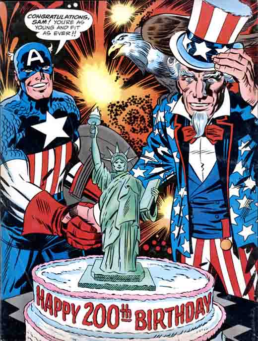 Esa es la premisa de Las Batallas Bicentenario, un proyecto con cierto tufillo patriótico que celebraba el bicentenario del nacimiento (independencia) de Los Estados Unidos. Sí, es Kirby, cualquier idea, por muy insólita que parezca, llega a buen puerto. Talento en estado puro es lo que vamos a poder encontrar en cada una de las páginas, talento y a Benjamin Franklin, a Gerónimo, un musical made in Hollywood o problemas más serios como el de la esclavitud o el trato recibido por los nativos americanos.
