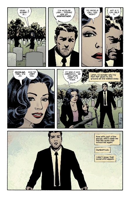 Una época inmejorable en la que, ya desde la primera página, Brubaker sitúa a Josephine, la femme fatale que oculta un secreto capaz de arrastrar a cualquier hombre a la perdición. Y el elegido es un tal Dominic Raines, un periodista que resulta ser el fallecido protagonista del funeral que abría el número unas pocas páginas atrás. El misterio está servido y la trama, a partir de ese momento, comienza a complicarse con la inclusión de Walter Booker, un poli corrupto ex-amante (o amante) de Jo y alguien a quién llaman El Obispo, un oscuro mafioso que sirve a Brubaker como elemento mediador en la introducción de una componente que comenzaba a intuirse pero no terminará de explotar hasta bien avanzada la historia; la sobrenatural.