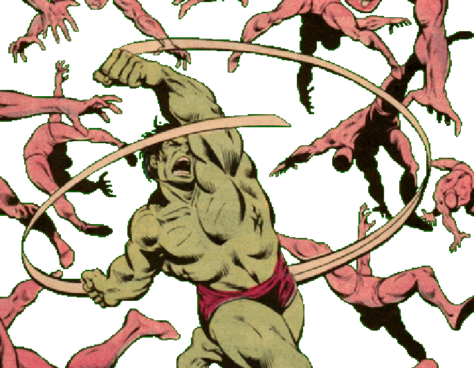 De pequeño pensaba que Hulk eran solo tortas. Luego llegó a mis manos un cómic de tercera o cuarta mano en el que Hulk andaba por un extraño cruce de caminos y llegaba a un mundo en el que podía destrozar todo lo que quisiera. Dicho mundo finalmente era la caja de juguetes de un gigante y hulk se sentía vacío, volviendo al cruce de caminos.