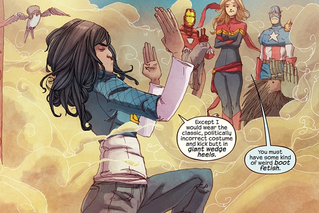 Más interesante que el hecho de tener que enfrentarse a los malos de turno, lo interesante del cómic es que Kamala es una adolescente post-11S que domina internet, que escribe fanfics, que debe soportar a su familia, pero que, como todos los adolescentes, debe encontrar su identidad: empieza imitando a su ídolo Carol Danvers para terminar con su propio uniforme y codeándose con veteranos como Lobezno.