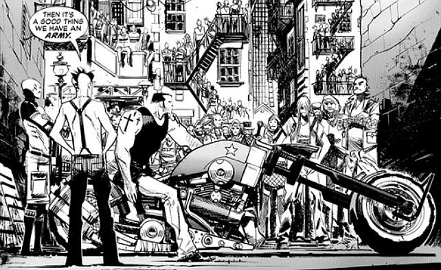 Con este planteamiento tan cercano a esa maravilla de película que era ‘El show de Truman‘, se inicia esta obra de Sean Murphy (‘American Vampire’, ‘Hellblazer’), aunque, naturalmente, no todo será tan sencillo. El chico se convierte rápidamente en una estrella mediática, pero las influencias clandestinas que tiene, la manera en que el programa trata a su madre, y el descubrimiento de la verdad que hay tras su nacimiento harán de él un rebelde. ¿Y qué actitud hay más rebelde que el punk? Bueno, posiblemente haya otras más rebeldes y revolucionarias hoy en día, atendiendo a cómo el mercado ha logrado incorporar la estética punk a su afán de lucro. Por ejemplo, el black metal: totalmente anticomercial, y fuertemente anticristiano (y aún así, su cultura visual empieza a filtrarse dentro de las corrientes generales). Pero lo que queda del punk, fácilmente reconocible por todo lector mayor de quince años, es el espíritu iconoclasta, nihilista y desafiante que no se puede comprar.