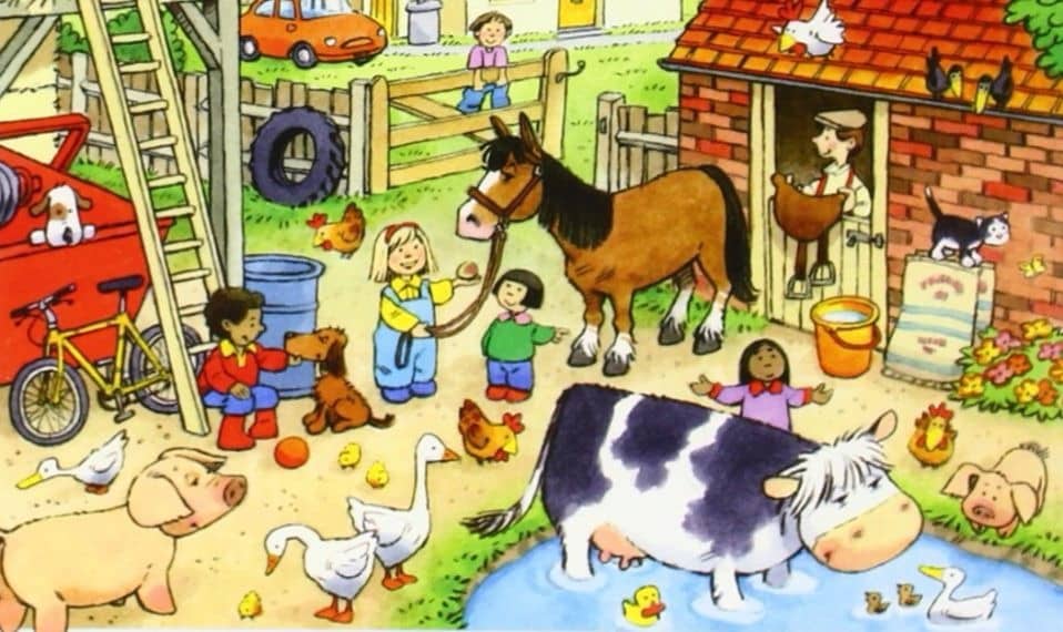 De la biografía de Cartwright poco os puedo comentar salvo los escuetos datos que uno encuentra en la wikipedia o en el sentido obituario que le dedicó The Guardian con motivo de su fallecimiento hace catorce años: nacido en Bolton, una localidad del condado de Lancashire, Cartwright estudió en varias escuelas de arte antes de terminar en el Royal College of Art londinense, y durante su trayectoria profesional siempre estuvo asociado a Usborne, una editorial bajo la que trabajaría hasta su fallecimiento y en la que vería publicado más de 150 libros. Su primer y más recordado éxito, ‘First Thousand Words…’ atesoraba tantísimo potencial didáctico en cualquier lengua, que Usborne terminaría publicándolo en 55 idiomas diferentes, y el pequeño pato que podíamos encontrar en todas las páginas del libro se terminaría convirtiendo en una de las señas de identidad más conocidas del artista, apareciendo en todos y cada uno de sus proyectos infantiles posteriores como pequeño juego de «busca y encuentra» para los lectores.
