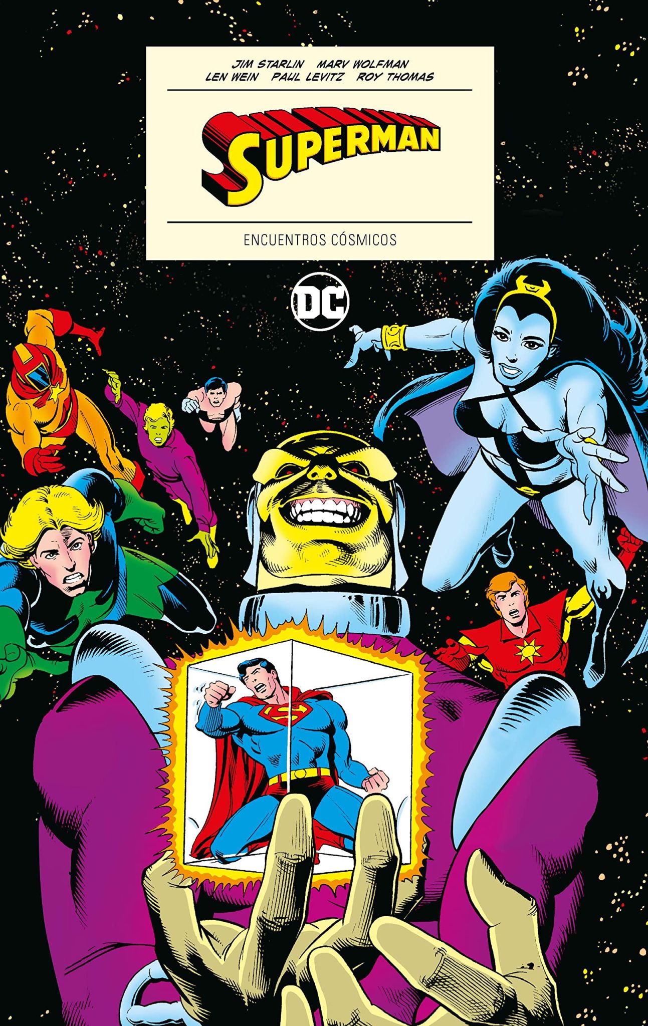 Y sí, desde la editorial no se han podido resistir a incluir el mencionado anual en el que el equipo creativo de Watchmen firman una de las historias definitivas del Superman pre-Crisis. Una cabecera, esta ‘DC Comics Presents’, que funcionaba a modo de Team-Up, por lo que vamos a ver desfilar por sus páginas cantidad de personajes invitados. Supergirl, El Detective Marciano, Starman, La Legión de Superhéroes o El Devorador de Soles, un amplio muestrario de lo mejor de la editorial que iban a protagonizar aventuras de marcado carácter cósmico, quedando patente cual es una de las debilidades personales del maestro Starlin. Aunque importante es la aportación del autor de Detroit no podemos pasar por alto el trabajo de otros grandes en estos relatos, gente que van desde Marv Wolfman o Len Wein hasta Roy Thomas, Paul Levitz, Curt Swan o los ya mencionados Moore y Gibbons. Parece que poco a poco, desde ECC, están empezando a creer que el material clásico de DC tiene su porción de mercado en nuestro país, existe un grupo de aficionados bastante numeroso y fiel que demandaba este tipo de cómic y, por fin, nos está llegando de manera más continuada. Una línea, DC Icons, que ya ha albergado maravillosos títulos de Jack Kirby (‘El Cuarto Mundo’, ‘Kamandi‘, ‘OMAC‘, ‘Demon‘) y sagas míticas de personajes como Flash, Batman o La Legión de Superhéroes. Aún queda mucho camino por delante pero no nos cabe la menor duda que con volúmenes como ‘Encuentros Cósmicos’ este recorrido va a ser mucho más placentero.