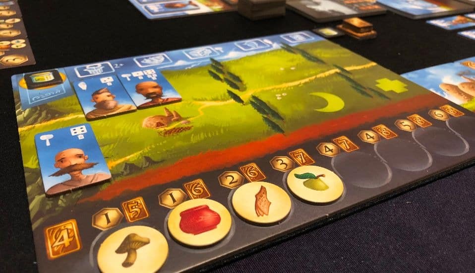 Pero, cuidado, como todo buen juego que se precie —y ‘Arriba y abajo’ es muy bueno— encontrar el equilibrio entre todas las posibilidades que se nos ofrecen es fundamental para llegar a puntuar de la manera más efectiva. Y lograrlo, alcanzar ese equilibrio, no es sencillo cuando hemos de tener en cuenta que hay que poseer camas suficientes en la villa para todos los habitantes —aquellos que superen el número que nos proporcionen las cartas, no podrán ser usados—; que construir los refugios de las cavernas pasa por haber explorado primero, y haberlo hecho satisfactoriamente —cosa que no siempre es factible—; que a la hora de explorar hemos siempre de considerar que nuestra reputación está en juego y que, como último añadido, contamos con la opción de ir guardando ciertos recursos en el tablero personal para que nuestros ingresos al final de cada ronda, y los puntos a la conclusión de la partida, vayan aumentando.