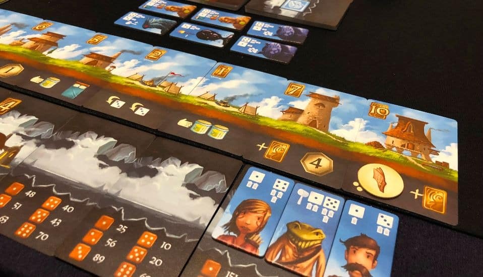 Teniendo como objetivo primario el construirnos el mejor asentamiento posible, cosa que iremos haciendo gracias a diferentes cartas —de almacenes, casas, talleres y, refugios en el subsuelo— que podremos ir adquiriendo durante las siete rondas sobre las que se prolonga cada partida, es a la hora de explorar las cavernas para extraer de ellas las riquezas que allí se ocultan donde la narración entra en liza: cada carta de exploración de caverna cuenta con seis opciones posibles, una por cara de un D6 que, una vez lanzado, nos indicará un número de párrafo al que habremos de dirigirnos en el libro de encuentros. Una vez en él, lo que encontraremos será un texto de ambientación y, normalmente, un par de opciones de exploración con unos requerimientos mínimos a conseguir.