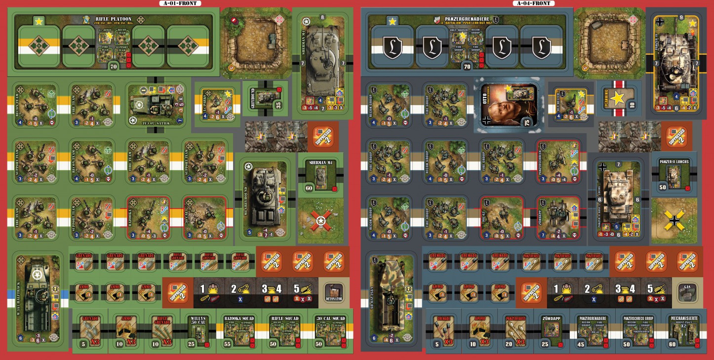 La escala de este juego es pequeña, a nivel de escuadra. Cada token representa, bien a un grupo de 4-5 hombres, un vehículo, oficiales o héroes (un solo hombre). En cada token de unidad tenemos toda la información que necesitamos saber de ella: nombre de la unidad, movimiento, potencia de fuego y defensa, y también en algunos casos, habilidades especiales de esa unidad.